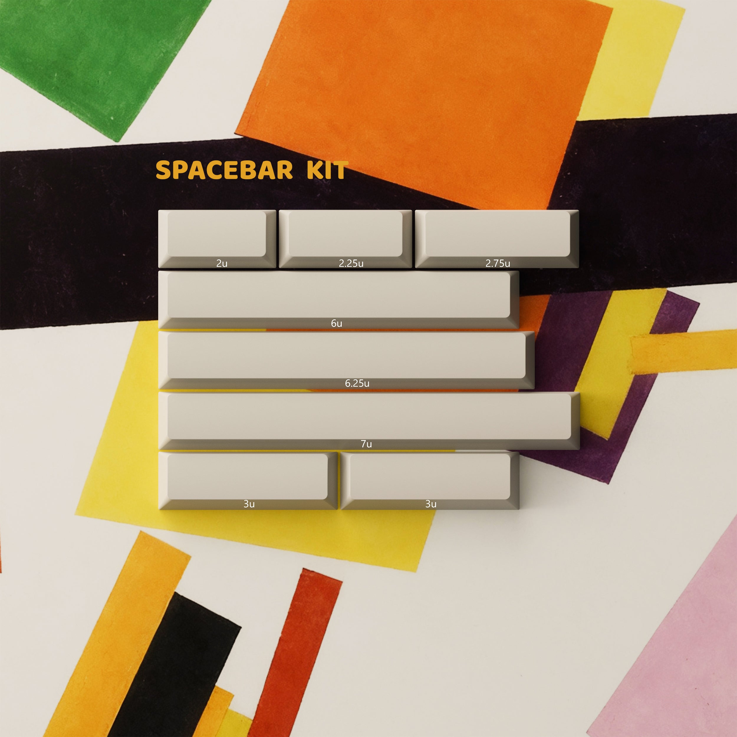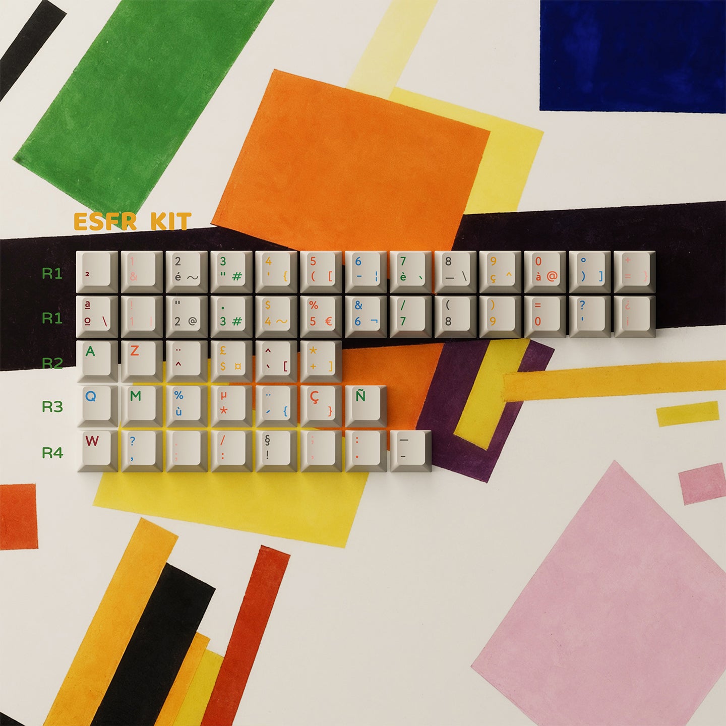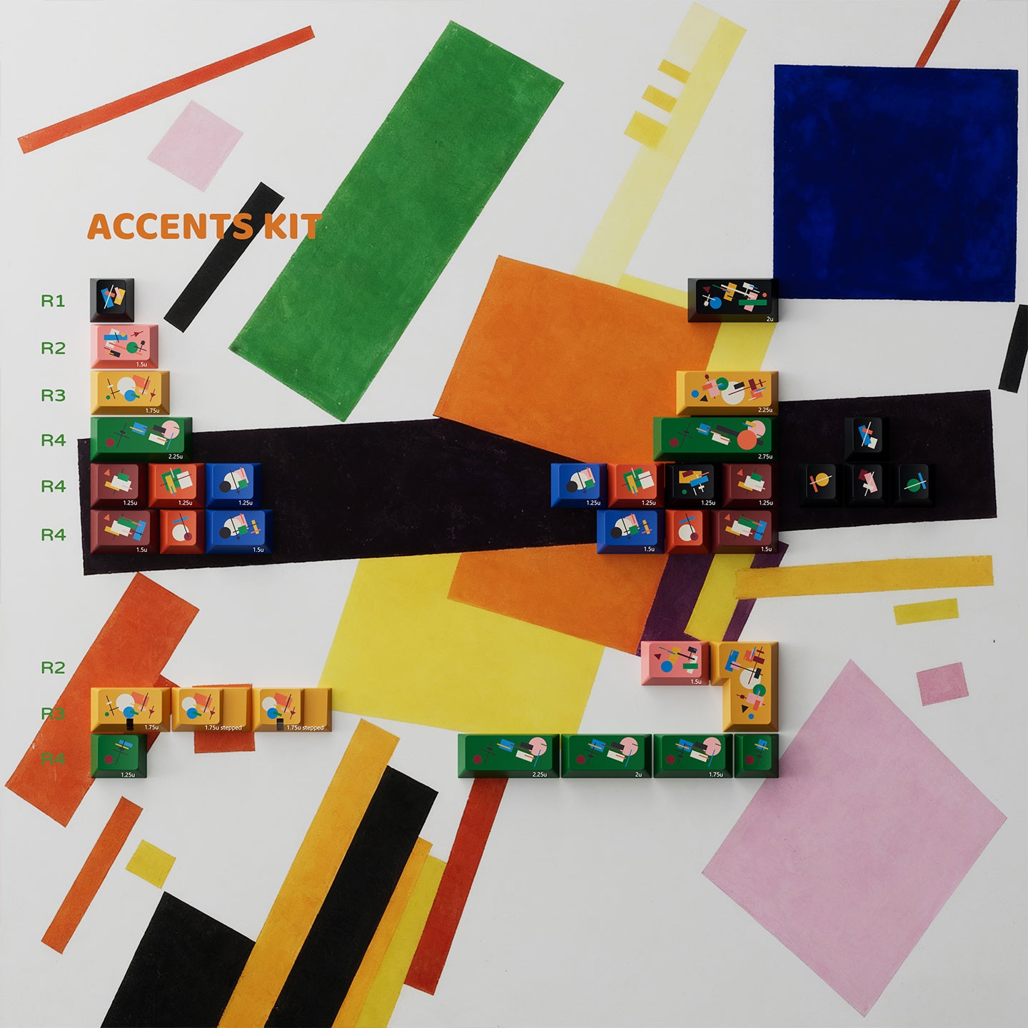 PBTfans Absoluteは、カジミール・マレーヴィチのシュプレマティスム芸術運動からインスピレーションを得ています。このセットは、温かみのあるベージュのベースカラー(GMK L9)をキャンバスとしており、シュプレマティスムの非論理主義の原則に従った幾何学的構成が特徴です。厳密な階層なしに重なり合う幾何学的な形、従来の調和を追求しない色の組み合わせ、そして空間に自由に浮かぶ要素。これらの構成は象徴的な意味を持たず、純粋な視覚的形態として存在します。そのため、このキーキャップセットには深い意味はなく、純粋に視覚的に楽しむことを目的としています。
