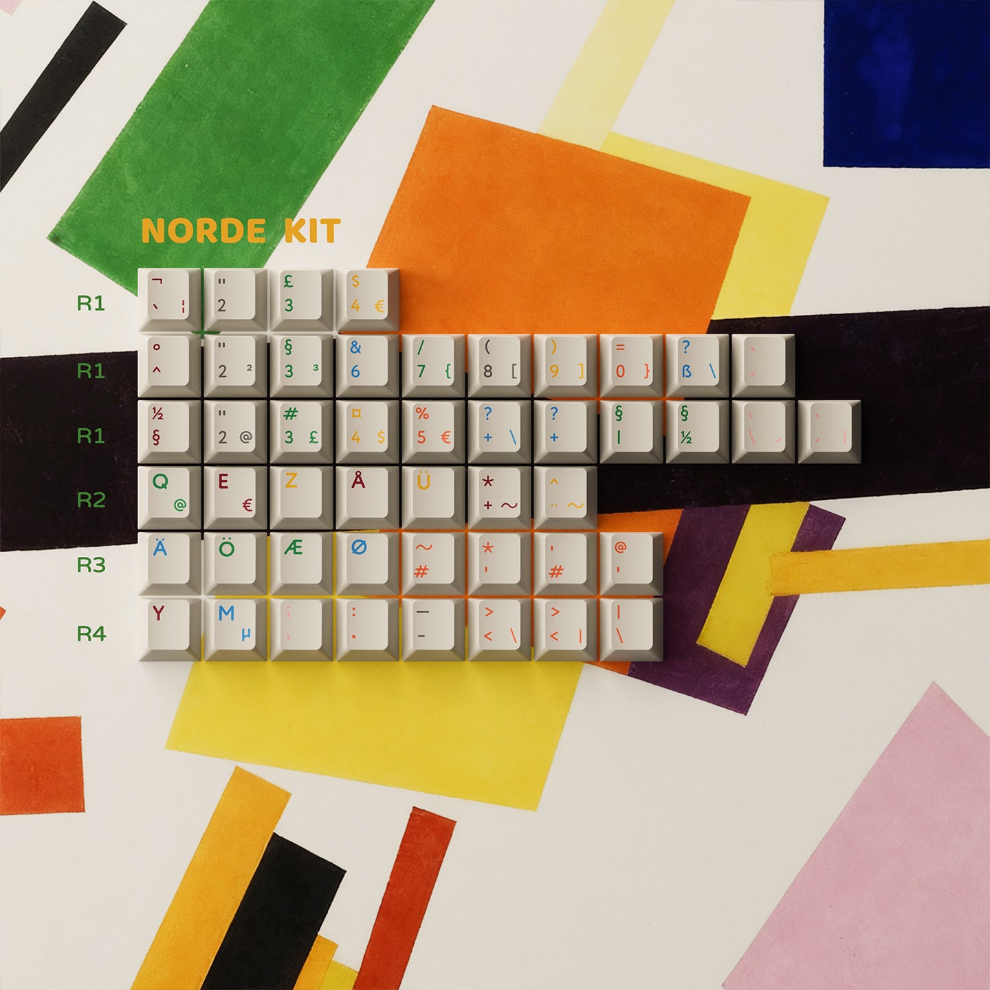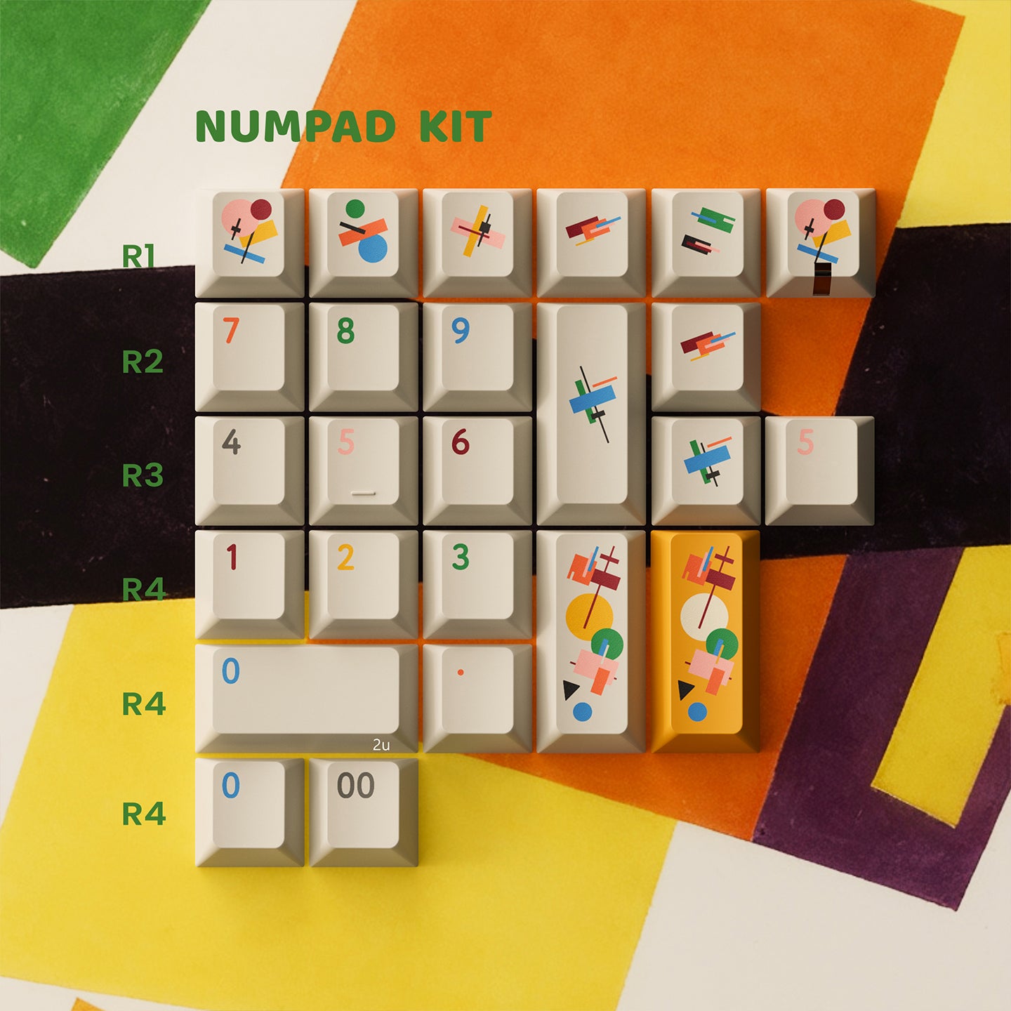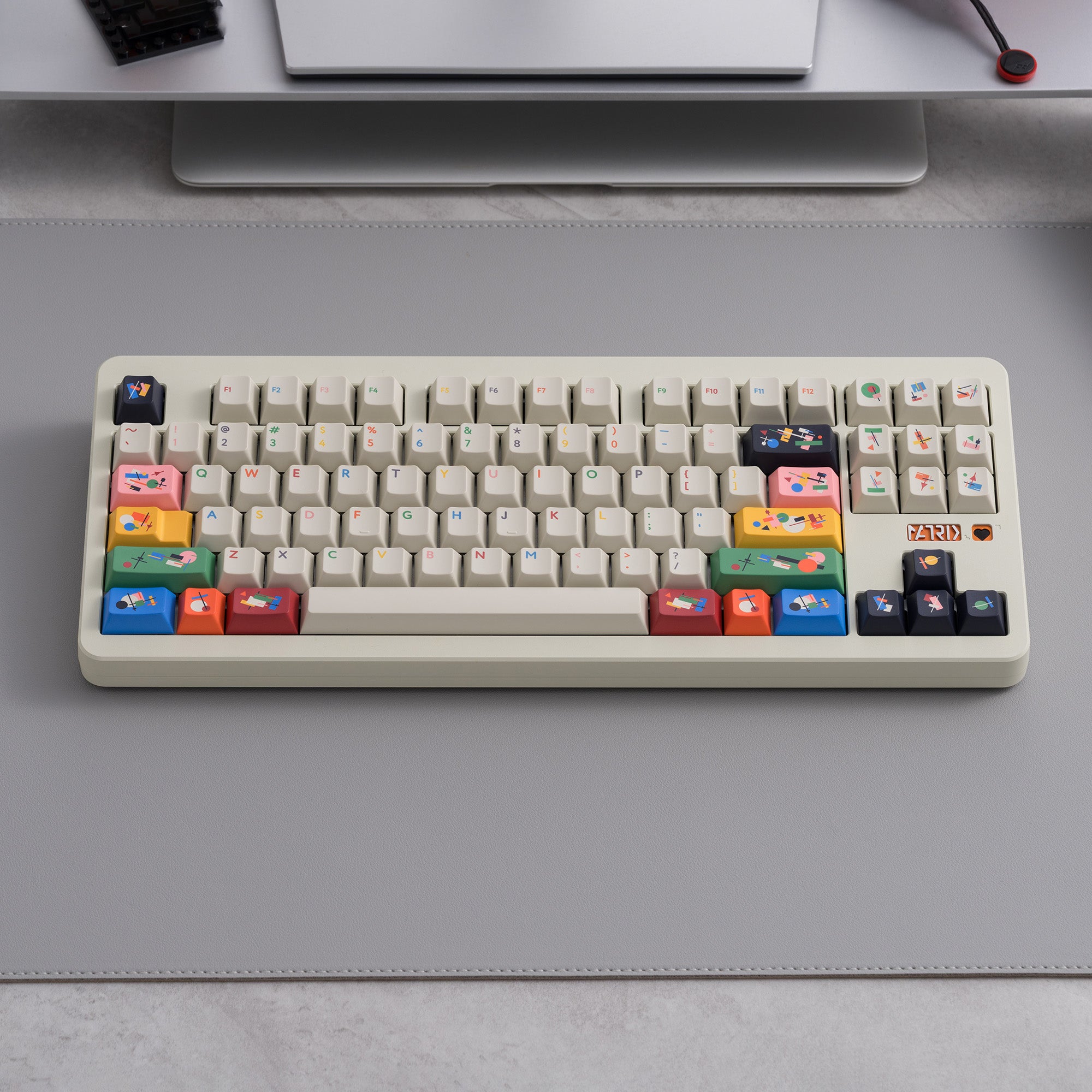 PBTfans Absoluteは、カジミール・マレーヴィチのシュプレマティスム芸術運動からインスピレーションを得ています。このセットは、温かみのあるベージュのベースカラー(GMK L9)をキャンバスとしており、シュプレマティスムの非論理主義の原則に従った幾何学的構成が特徴です。厳密な階層なしに重なり合う幾何学的な形、従来の調和を追求しない色の組み合わせ、そして空間に自由に浮かぶ要素。これらの構成は象徴的な意味を持たず、純粋な視覚的形態として存在します。そのため、このキーキャップセットには深い意味はなく、純粋に視覚的に楽しむことを目的としています。