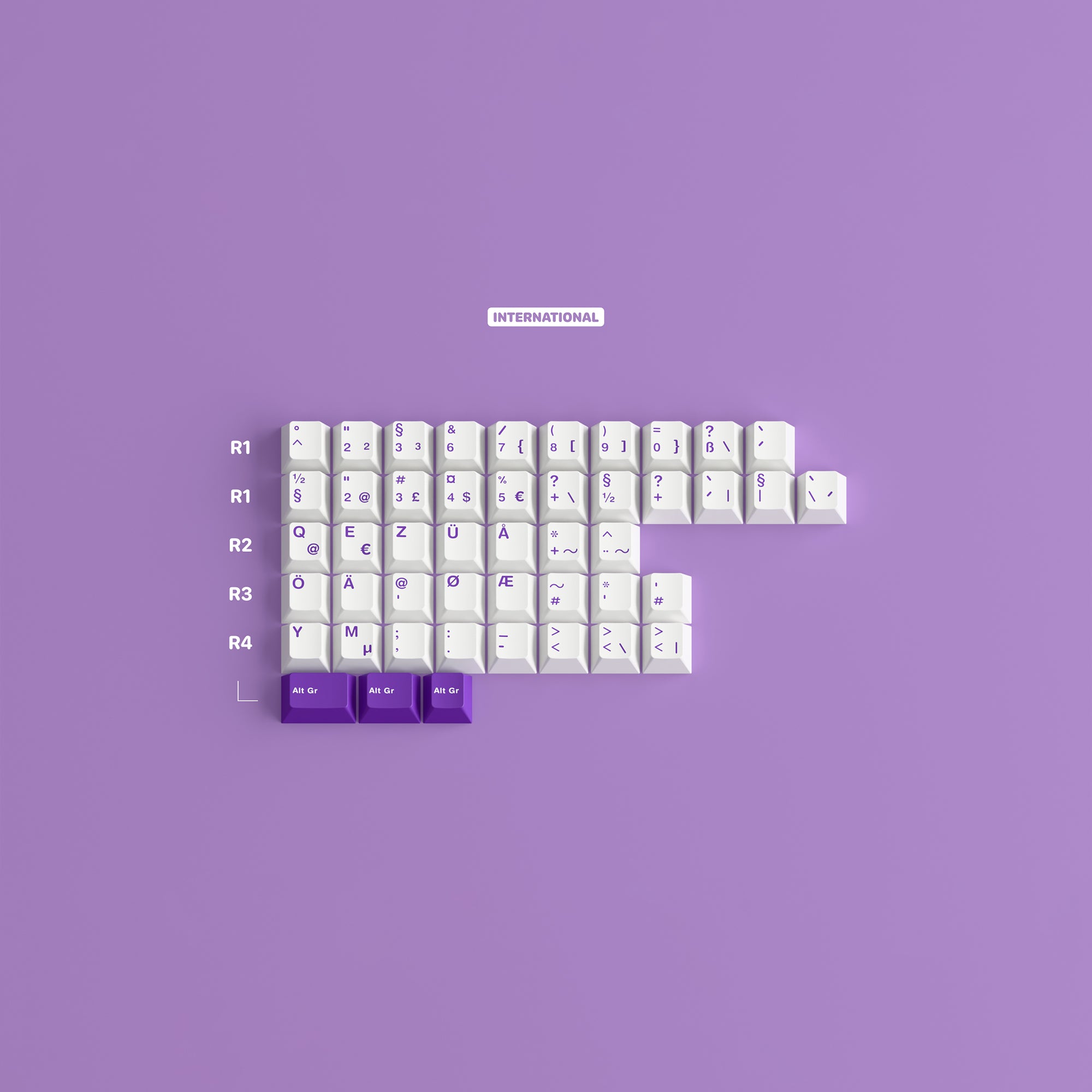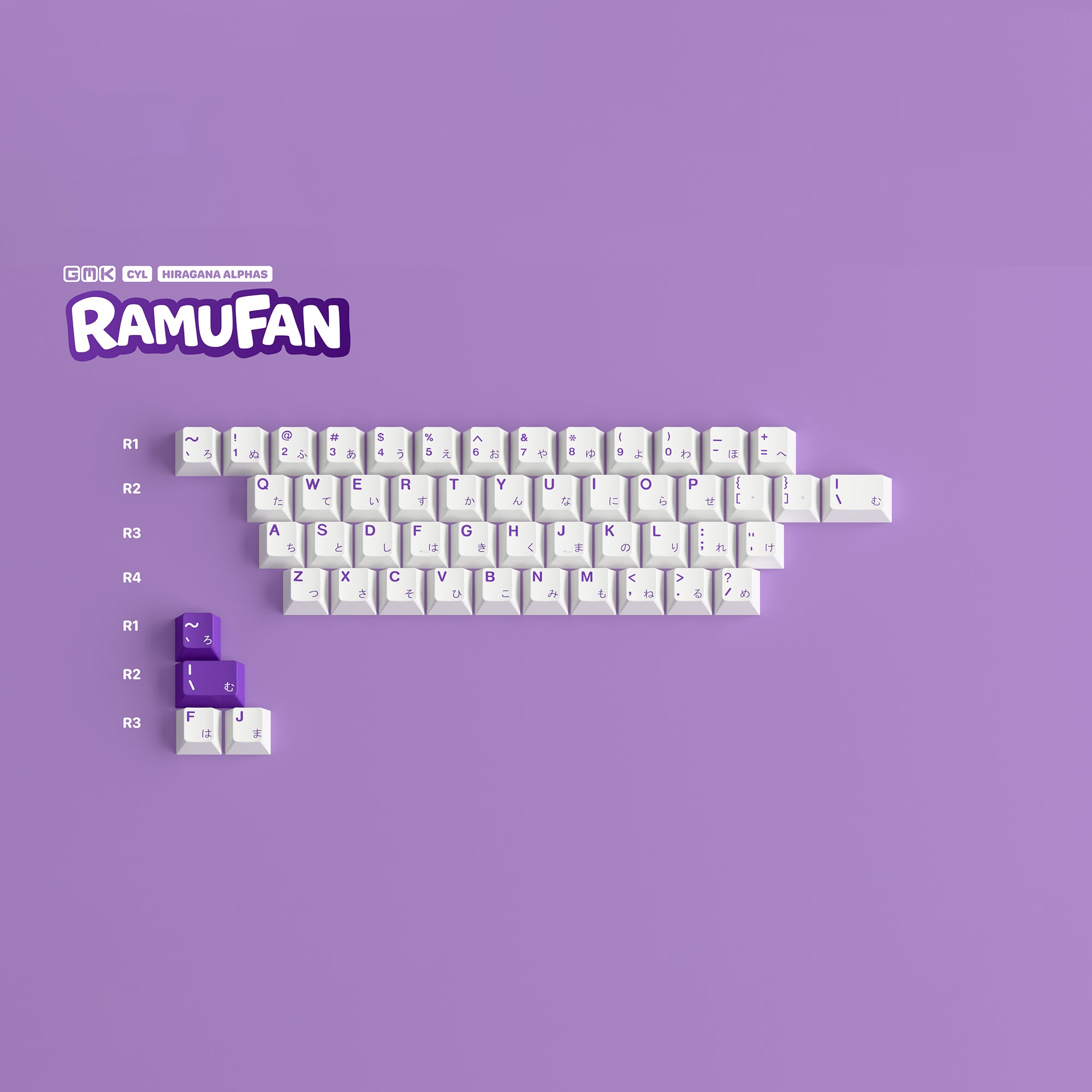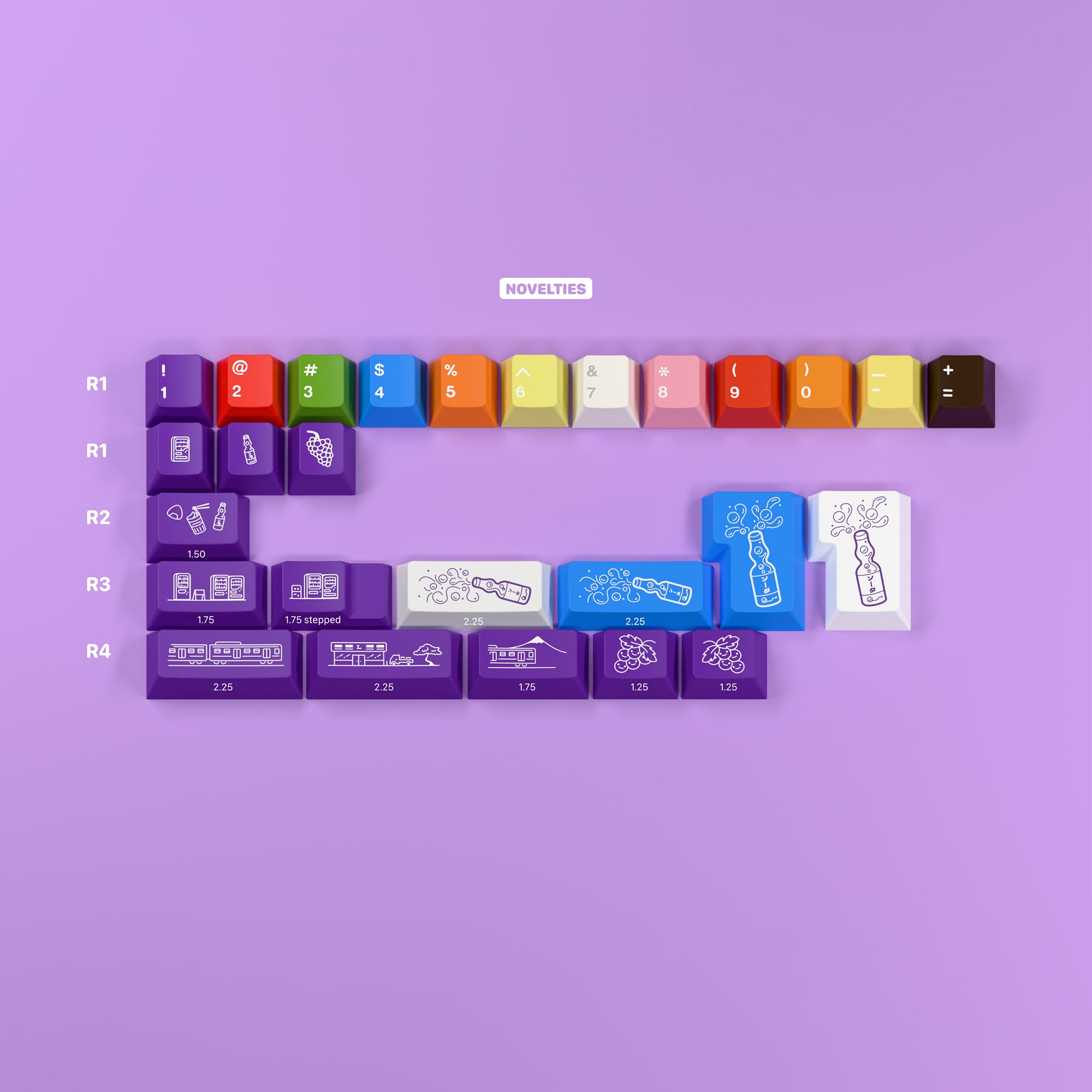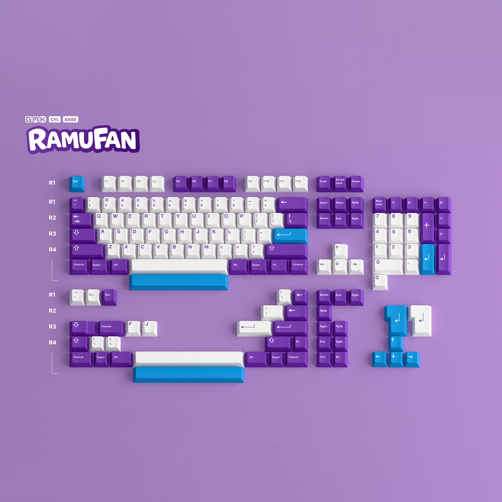 Ramu Fan is a keycap set inspired by one of my favorite Japanese soda drinks, ラムネ, known in English as Ramu Bottle. This set takes its main cues from the bright, nostalgic grape flavor, capturing the playful sweetness of fizzy candy drinks and summer festival energy.