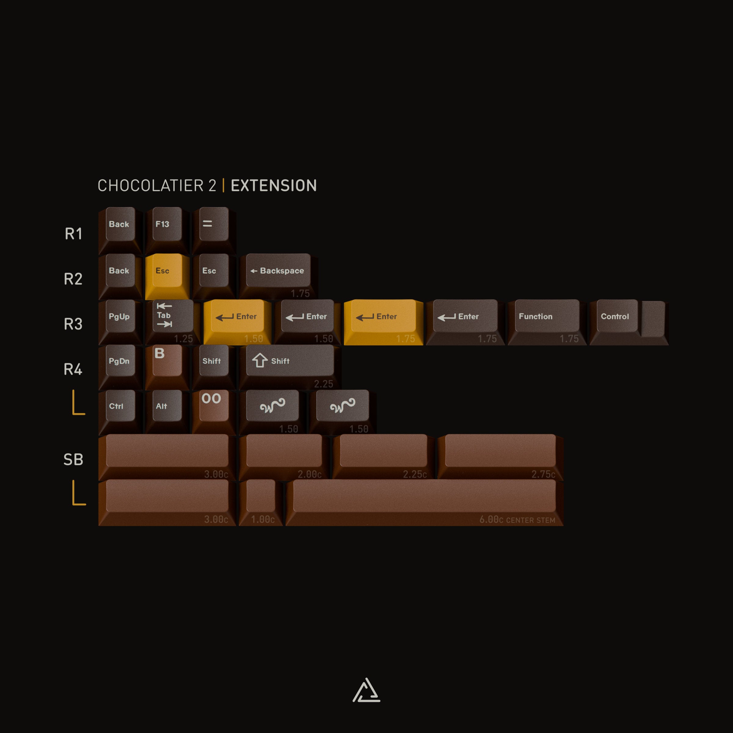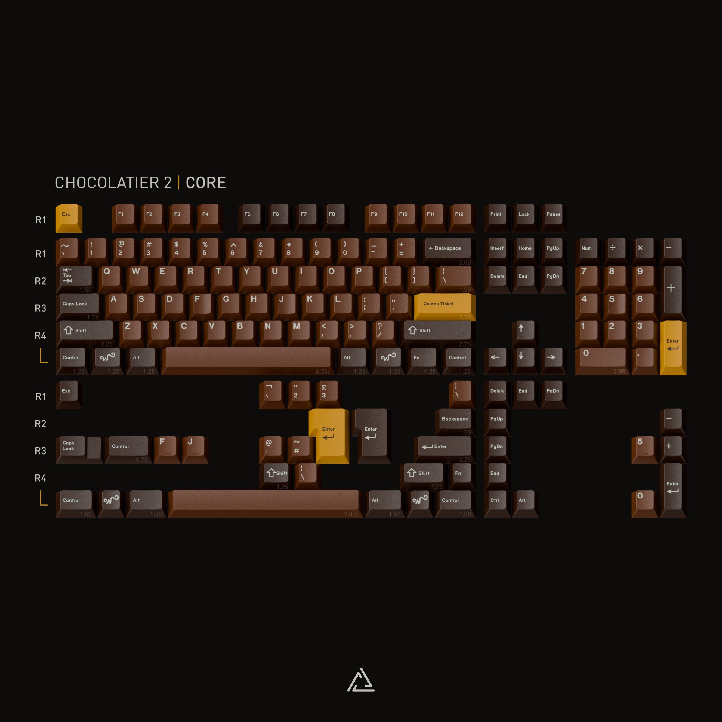 A: You might see this set listed under a few slightly different names across various vendors, such as "GMK Chocolatier 2," "GMK Chocolatier 2 (CYL)," or "GMK CYL Chocolatier 2". The "CYL" simply stands for "Cylindrical." GMK uses this tag to differentiate their classic, original Cherry Cylindrical profile (1-1-2-3-4-4) from their newer profiles, like MTNU. Regardless of which of these acceptable names a vendor uses on their storefront, they all refer to the exact same keycap set.