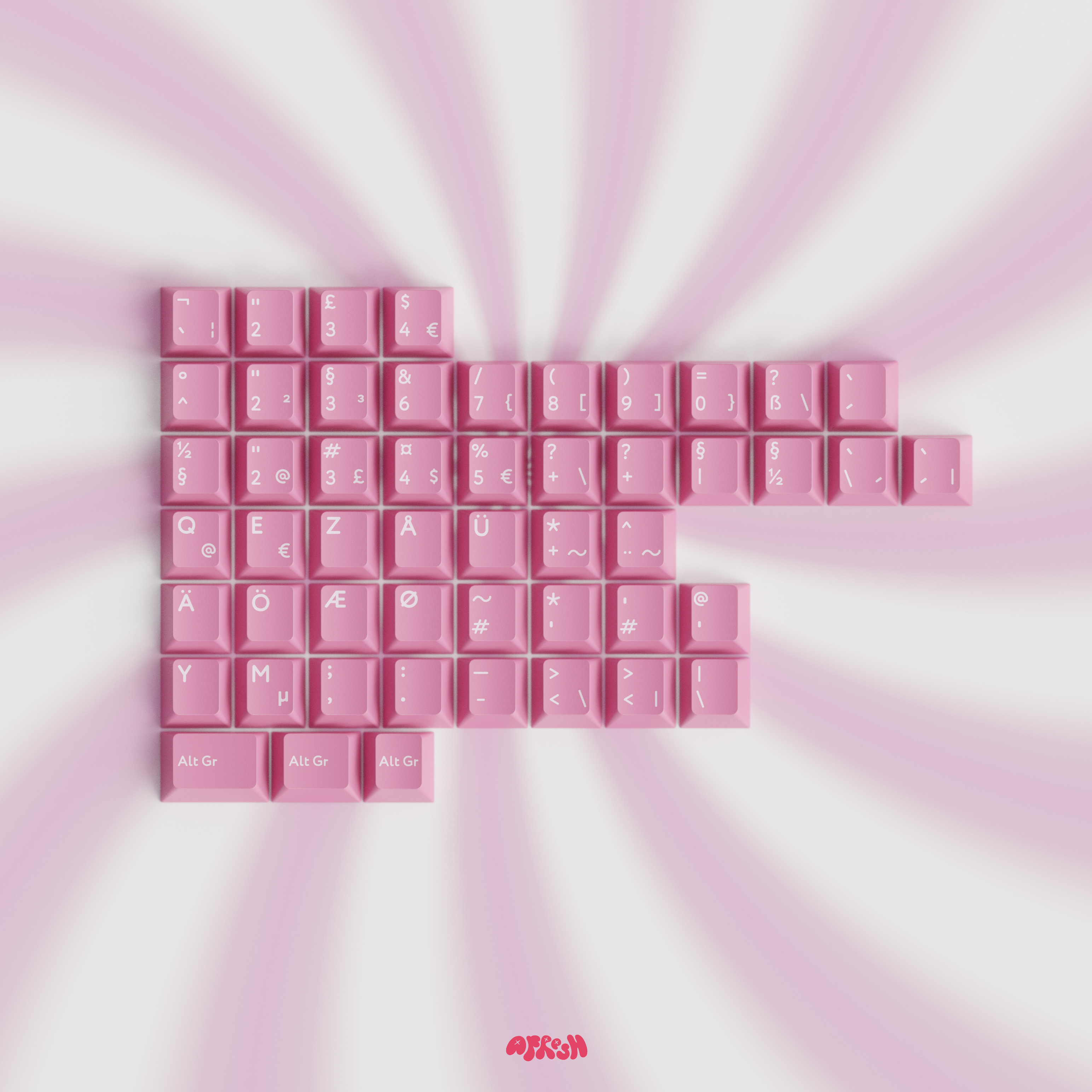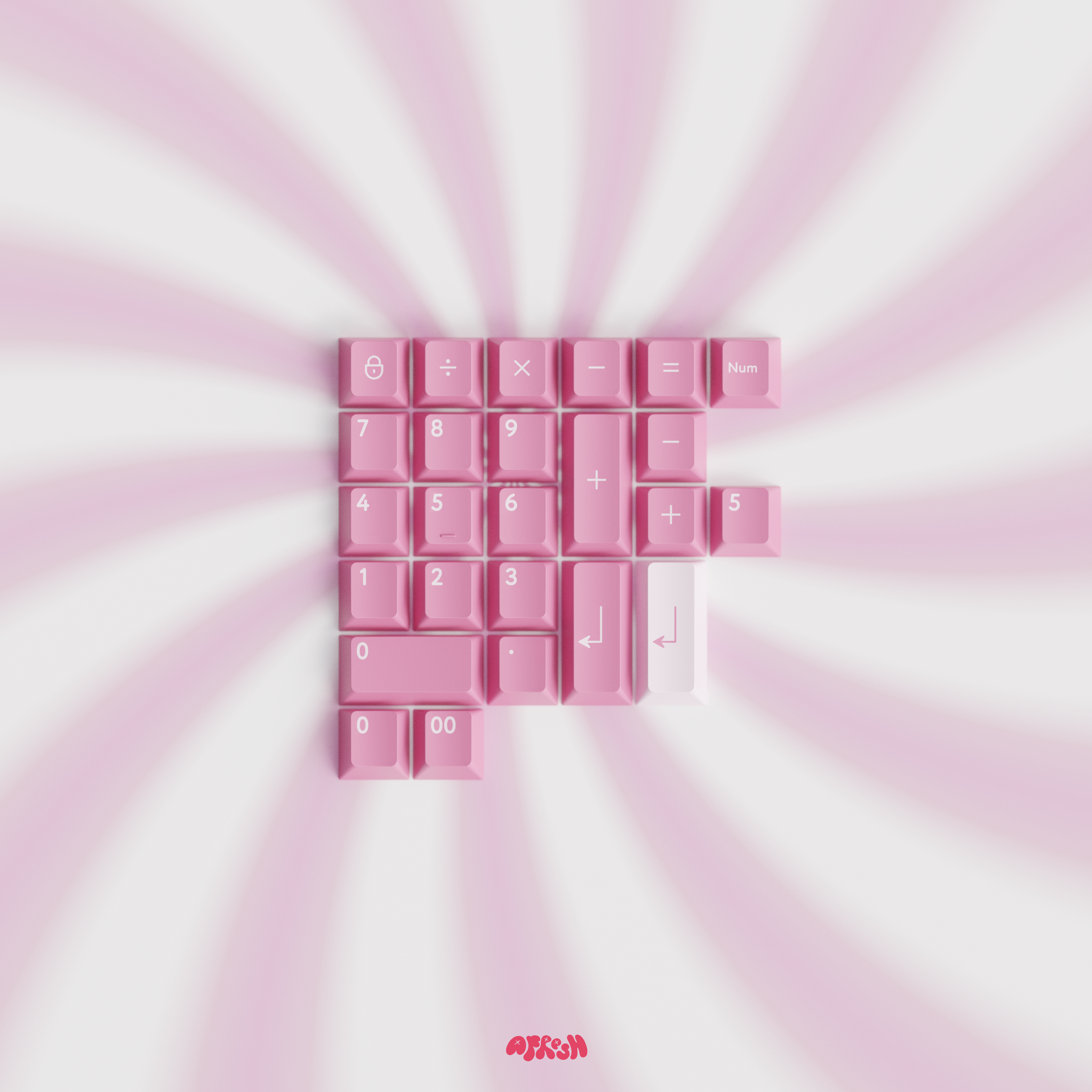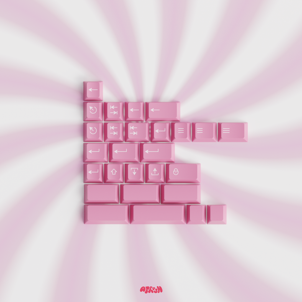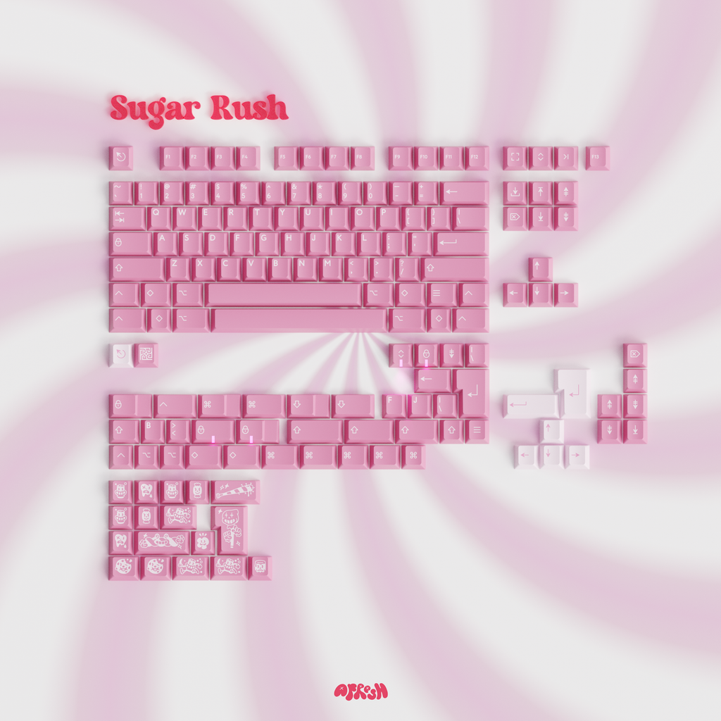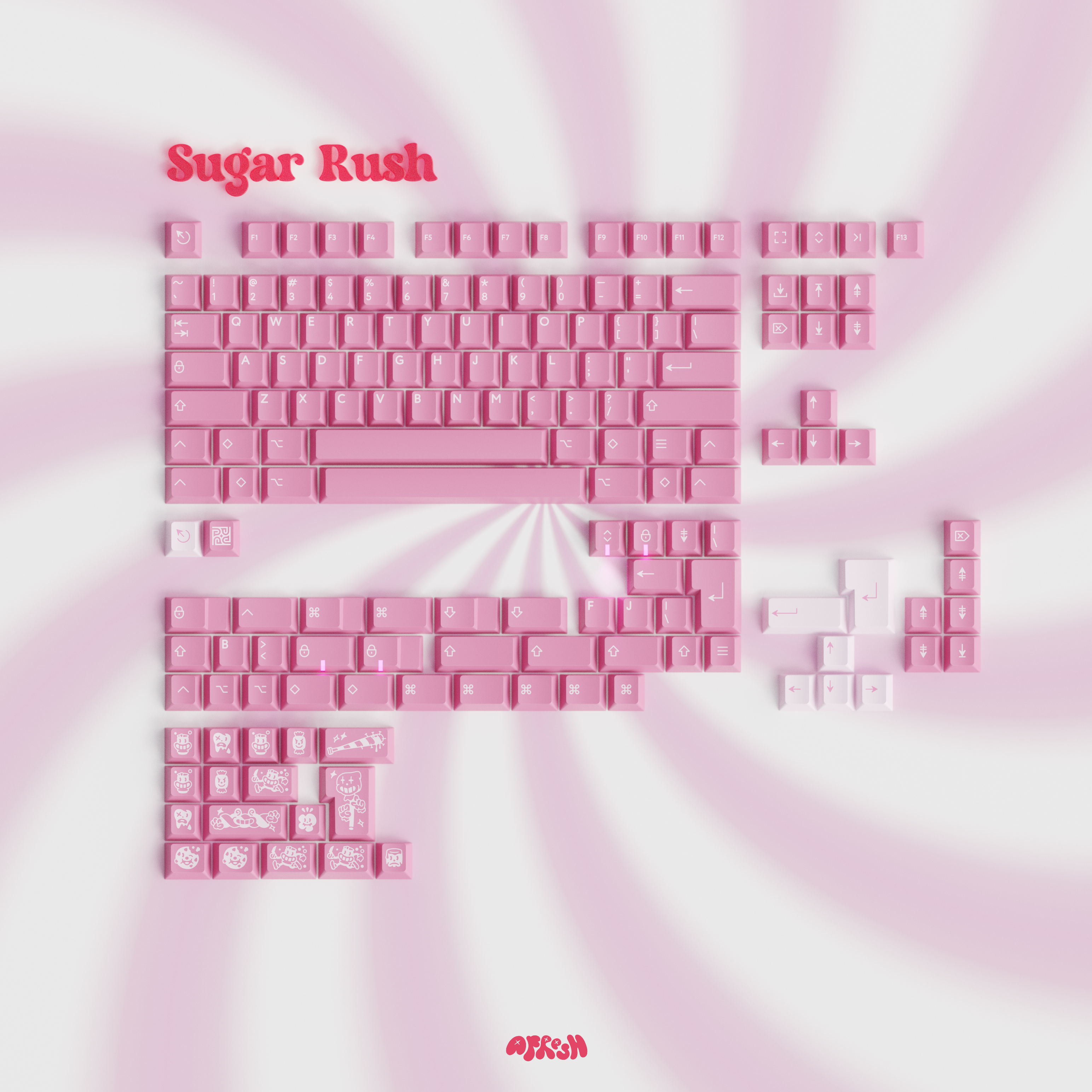 PBTfans Sugar Rush keycap set is a playful and colorful collection inspired by a variety of sweets like bubblegum, cotton candy, and glazed donuts. The keycaps are a soft pastel pink, with multicolored glitter that gives them a sparkly, donut-like appearance.